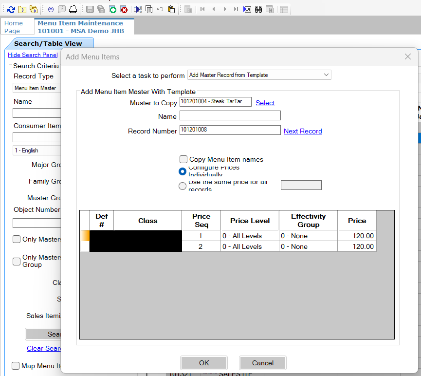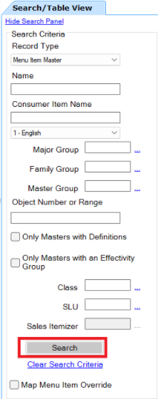 Click Search to load menu items