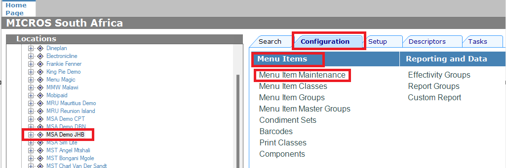 Select Configuration → Menu Item Maintenance